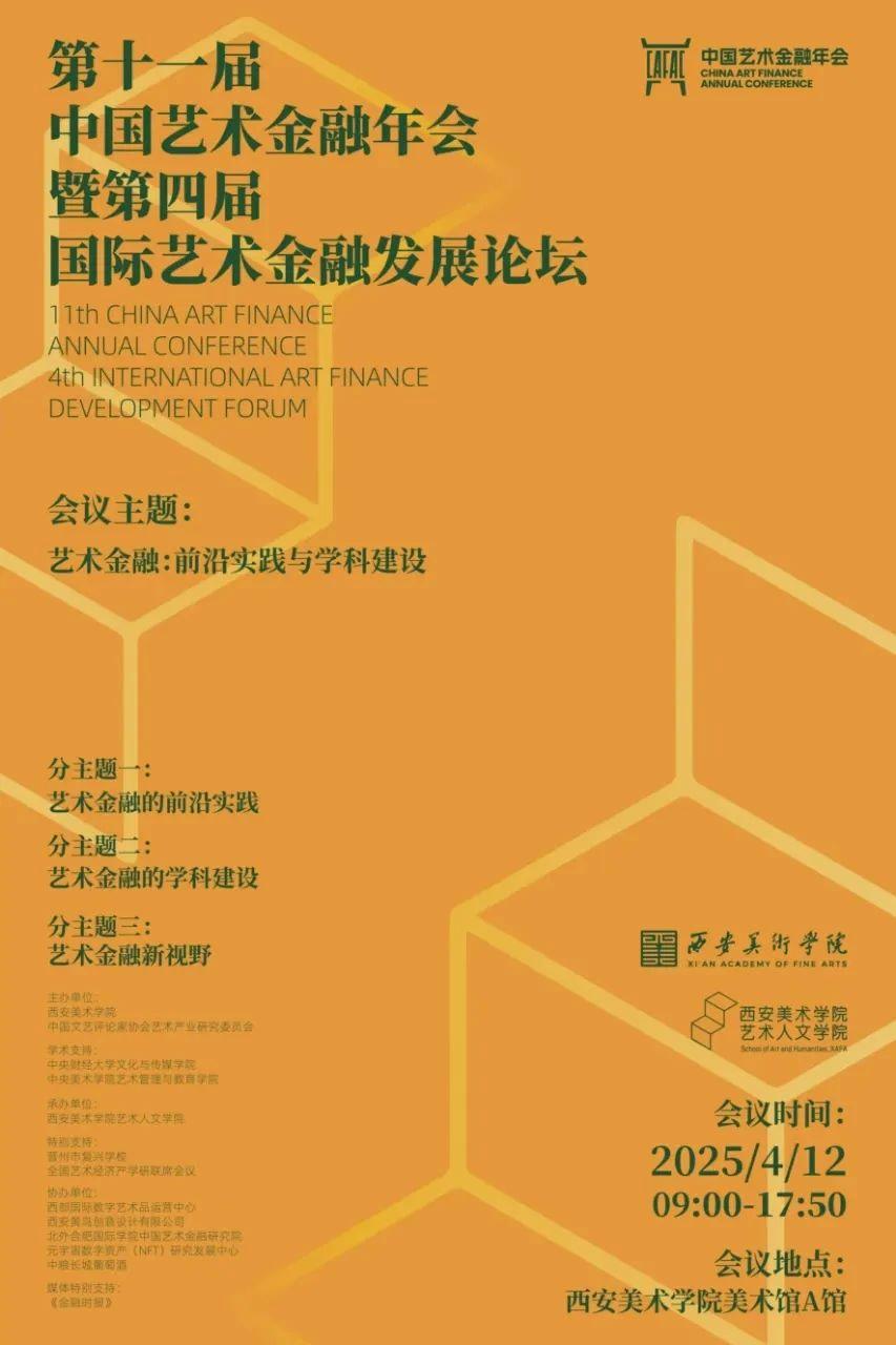 2025年4月12日,由西安美术学院、中国文艺评论家协会艺术产业研究委员会主办,中央财经大学文化与传媒学院、中央美术学院艺术管理与教育学院学术支持,西安美术学院艺术人文学院承办,晋州市复兴学校、全国艺术经济产学研联席会议特别支持,西部国际数字艺术品运营中心、西安黄鸟创意设计有限公司、北外合肥国际学院中国艺术金融研究院、元宇宙数字资产 (NFT) 研究发展中心、中粮长城葡萄酒协办,《金融时报》媒体特别支持的第十一届中国艺术金融年会暨第四届国际艺术金融发展论坛在西安美术学院成功举办。本次会议聚焦“艺术金融:前沿实践与学科建设”主题,旨在积极推动艺术金融的学科建设,促进新时代艺术金融理论研究和产业创新发展,加强艺术金融国际化交流合作。