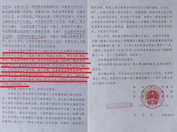 在法庭上,国君公司法定代表人称与本公司无关。金源地产和淇奥公司的律师和法定代表人则称已经给付了原告工程款8000多万元,并不拖欠原告工程款,并拿出了双方签字的证据。但原告徐凤琴一方则称,依据双方当初签订的合同和已经生效的通辽市中级法院(2019)内05民初20号判决书的确认,吉地华府工程造价为每平米1700元人民币,总造价应该为13700多万,还有合同以外的项目工程款1000多万元,刨除对方已经给付的8000多万元,还有6000多万元未能给付。