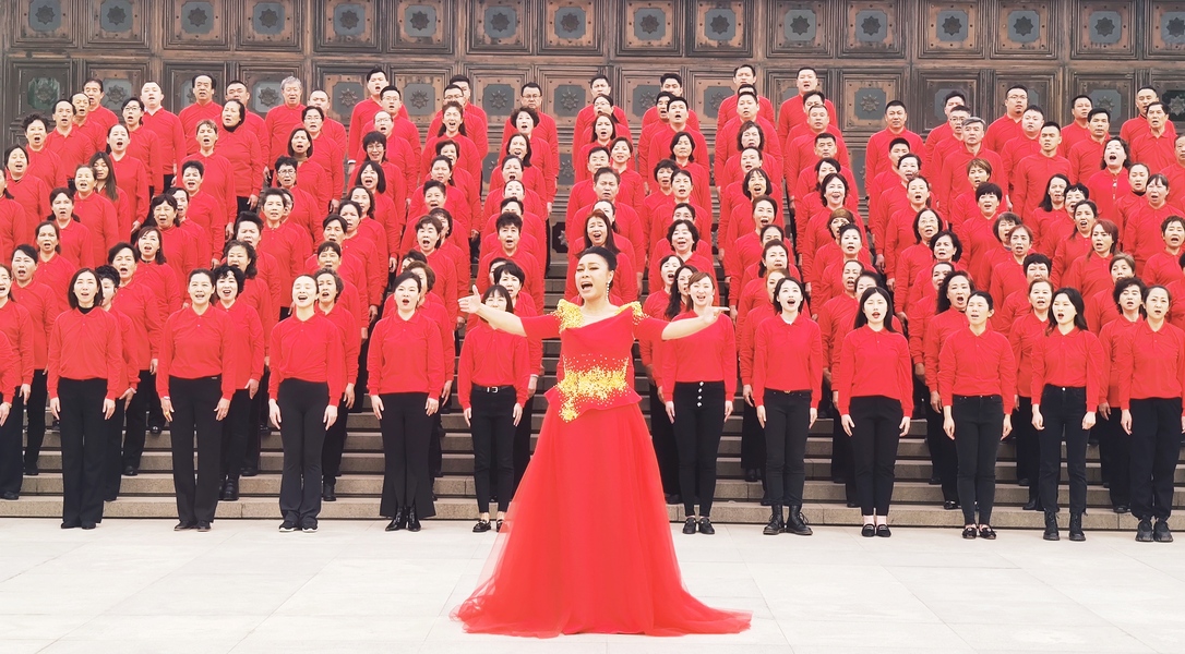 上午8点,“书写你的历史一笔一划,学习你的文化精深博大……”嘹亮的歌声在卢沟桥抗日战争纪念馆前响起。身着中国传统特色服装的单待用直击灵魂的“单氏唱腔”和浓浓的爱国情怀唱出了她对中华民族的深情、厚爱和骄傲与自豪。由200多人组成的合唱团身穿红色服装,犹如一片红云,在蓝天的映衬下,热烈、祥和、吉祥。主唱的歌声悠扬又不失阳刚,和声厚重柔和。
