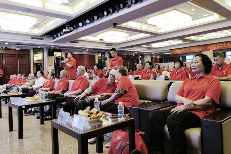 为了筹备1953年10月在北京举办的全国田径、体操、自行车运动大会,解放军八一体操队正式成立,这是建国初期举办的第一个国家级大型运动会,为了提高我军的战斗力,1941年八路军129师带头早早就开展了单杠,双杠以及跳木马的训练,1953年的全国运动会我军体操选手取得了男女全能前四名的辉煌成绩,赛后正式成立了中央体育训练班,我军五男五女入选,中央体育训练班就是国家体操队的前身,所以后人常说先有八一体操队后有国家体操队,解放军八一体操队是一支成绩优异、英雄辈出的队伍。建队70年来,在全军各级组织领导下,在国家体育总局和地方政府,以及全军指战员大力支持下,经过几代人的共同努力,先后3人4次夺得奥运会冠军,16人次夺得世界冠军,146人次夺得全国冠军,18次夺得全国团体冠军,先后培养了我国第一个体操世界冠军马燕红,以及奥运冠军马艳红、肖钦、刘洋,世界冠军许志强、国林跃,亚洲冠军以及优秀的运动员廖润甜、徐泰明、黄惠梅、国林显、国林生、何秀敏、李德志,战友们更没有忘记为国家和军队的体育事业做出突出贡献的功勋前辈杨绍虞、陆恩淳、吴树德、韩毅、邹义鹏、徐仁杰、高福林、王斌、欧阳丽驹、陈孝彰、温小铁、蓝亚兰、罗秀霞、白凤池、李世铭、邱贤烈,还有优秀的教练员:周济川、金卫国、陈广生、刘仕贤、孙万里、王雪、王天虹、乔良、赵成昌等。因身体原因未能到场的原八一功勋前辈、八一体操队第一任队员、国家体操队第一任队长、我国第一个自由体操全国冠军、第一批国家级运动健将陆恩淳以视频的方式向大会表示祝贺。他的一句话感动了现场所有人员他说道:用伟大和辉煌形容这只队伍一点也不为过。