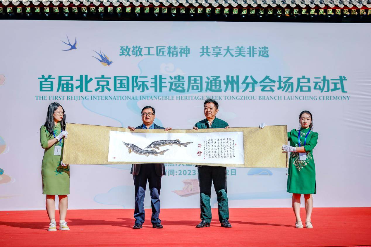 在活动现场,还进行了通州非遗logo的公开征集以及大师作品捐赠。国际工艺美术大师李佩卿和鱼拓非遗传承人胡守庆老师,分别捐赠了“景泰蓝鱼跃瓶”和“中华鲟拓献冬奥”两件艺术珍品,表达了艺术家对大运河畔人民生活的美好祝福以及对奥运精神的致敬。
