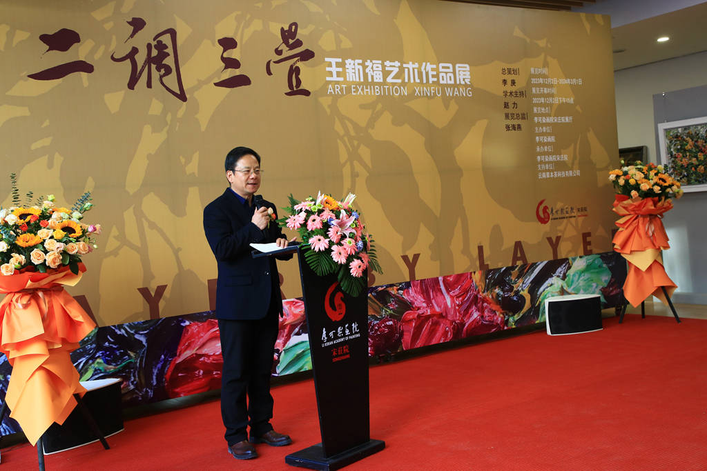 由李可染画院主办的“二调三叠”王新福艺术作品展2023年12月2日下午在李可染画院宋庄院开幕。李可染画院院长、中国河山画会会长李庚教授,中央美术学院艺术管理与教育学院副院长赵力教授,北京大学经济学院教授、产业与文化研究所常务副所长王曙光先生,中国文艺评论家协会艺术产业委员会主任、李可染画院副院长西沐教授,中国金融书协主席、李可染画院副院长郭永琰先生,中国金融书协副主席、阳光保险集团副总裁夏芳晨先生,中央文史馆书画研究员、中国书协篆刻委员会委员、李可染画院研究员王德恭先生,中国金融书协副主席马奔先生,中国美术馆展览部主任、研究员邵晓峰先生,中央美术学院美术馆书记韩文超先生,高等教育出版社艺术分社社长梁存收先生,北京外国语大学艺术研究院院长宁强教授,北京工商大学区域金融研究中心主任杨德勇教授,中国嘉德投资公司投资总监马学东博士,中国工艺美术出版社社长陈高潮先生,中央财经大学文化与传媒学院党委副书记、纪委书记宗娅琮女士,今日美术馆副馆长晏燕女士,《中国非物质文化遗产》杂志副主编蒲宏凌先生,中国拍卖行业协会艺术品专委会秘书长余锦生先生以及来自金融界、出版传媒界、律师界、企业界的朋友、青年艺术家代表共100余人参加了开幕式。