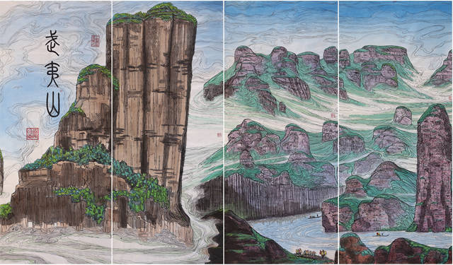 我们走到仁化丹霞、武夷山画幅前,同样感受到大自然的鬼斧神工,将群山劈得陡峭险峻,还染上了红色,十分壮观。
