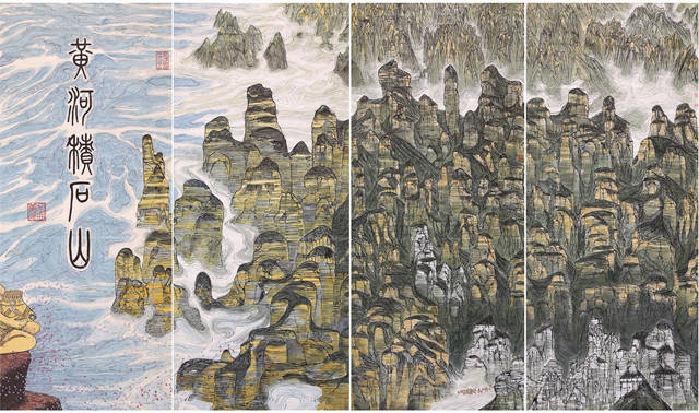 由黄河源到黄河入海,十三个段,在总长一百七十七米的画幅中我们见到牧民帐房,经幡、彩陶、水车、羊皮筏子、贺兰山岩画、龙门大佛、泰山等景观。黄河画面气势雄伟,处处呈现出桀骜不驯的血性和强烈的冲击力和震撼力。