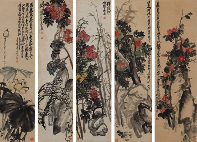 三者,我们将一饱“ 眼福 ”,充分地感受一 代宗师“大美 ”的艺术水准。“画之所贵贵存我 ”,“ 自我作古空群雄 ”。吴昌硕画作的最可贵处,就是古为今用,人为我用。不论画什么,都能画 出自己的独特风貌,画出自己独特的精气神。比如他把吴镇的风竹、郑板桥的瘦竹、蒲华的乱竹 结合起来,形成自己独特的“吴竹 ”;把沈周的山水、石涛的山水和张锡宁的山水结合起来,形 成自己独特的“吴氏山水 ”;把徐渭的荷花、八 大山人的荷花结合起来,形成自己独特的“吴荷 ”; 把明清两代流行的传统文人画与民间绘画、西洋 元素结合起来,把大雅与大俗结合起来,形成了极具时代特色的“吴氏彩墨花卉 ”,集古今为一体,熔诗、书、画、印为一炉,将中国文人画推上了一个新的高峰。