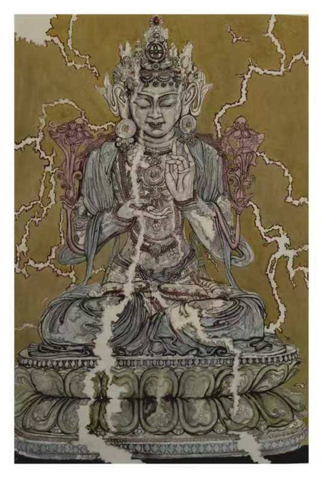 其次作品探索抽象化表达方式:创作中不拘泥于佛陀具体形象的刻画,而是将佛造像的符号、线条、形态等元素进行主观化处理,作品中不具体描绘某种具有地域特色的造型、纹样、色彩,而追求墨色的潇洒灵动和佛像质感的斑驳,在作品中用色含蓄克制,力图表达在墨气氤氲中的色彩,效果丰富而微妙。这和原有的佛造像客体已经有相当的距离,这表达了岁月带给佛造像的历史沉淀的厚重美感,这种对佛造像美感的个人解读就更具现代性。