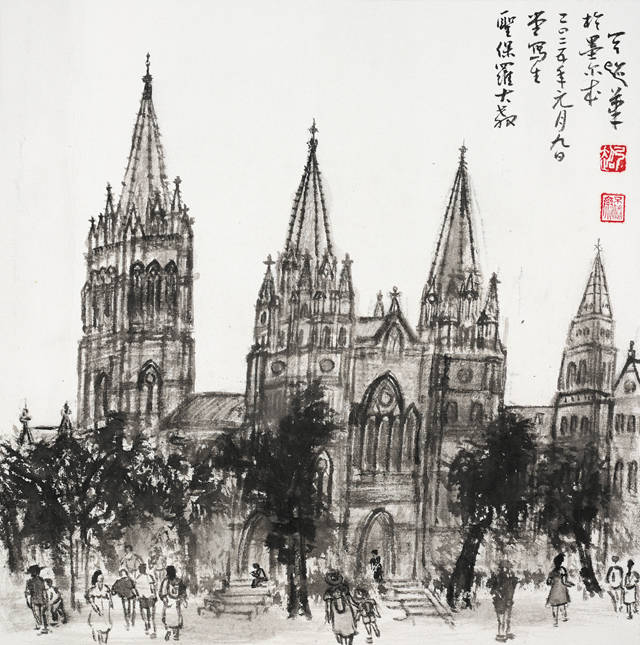 百桉藏景作为弓超海外水墨写生的重要构成部分,勾勒出史景同盛的新审美观,如建筑与巨木同高的《悉尼圣玛丽大教堂》,阳光下互为折射,相映成景;如树冠状似建筑投影的《墨尔本圣保罗大教堂》,自然与历史和谐共存,密不可分……世界的多元性与水墨的融合性,让他对写生领域的艺术前景有了更多向往和坚持。
