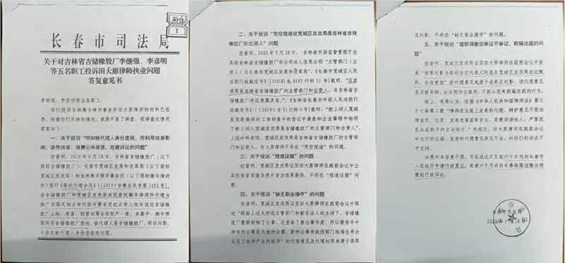 吉储橡胶厂职工表示:“吉林省律师协会会长田大原、省市场监管厅陈宇、王淑英等人践踏法律,把我们一生的血汗变成权力游戏的筹码!” 目前,职工已向中央巡视组、司法部递交材料,要求:立即撤销田大原吉林省律师协会会长职务,立案调查其违法违纪行为;彻查吉林省市场监管厅陈宇、王淑英等人违反中央八项规定及滥用职权问题。