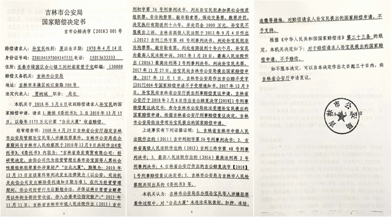 得到省公安厅的复议决定书,孙宝民似乎看到了希望,但吉林市公安局随后又于2018年5月4日做出吉市公赔决字[2018] 001号国家赔偿决定书,又称:“本机关认为,吉林市公安局在办理孙宝民等人涉嫌犯罪过程中,对‘台北大厦’未违法采取查封、扣押、冻结、追缴等等措施,对赔偿申请人孙宝民提出的国家赔偿申请,不予支持。”